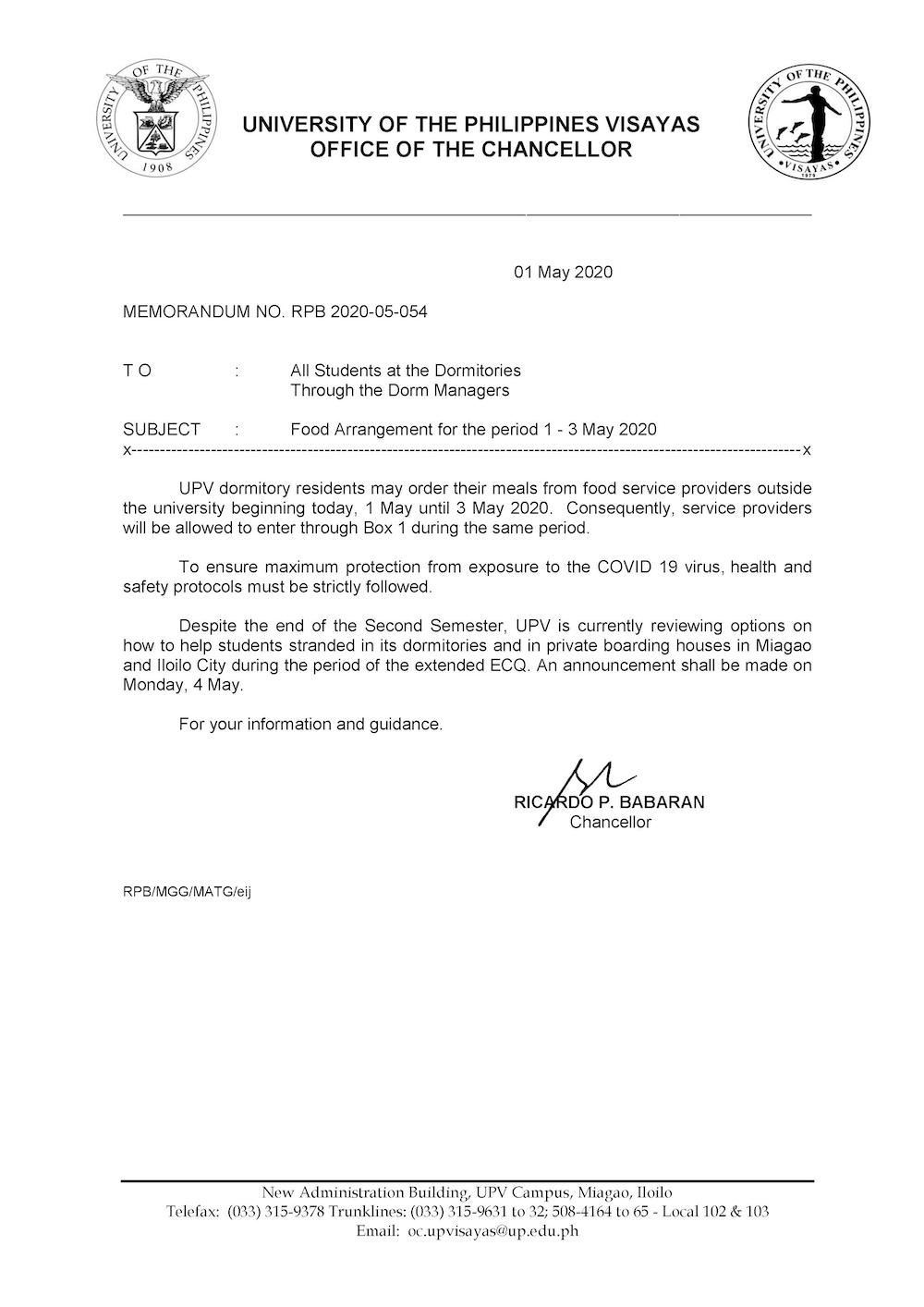 Despite the end of the Second Semester, UPV is currently reviewing options on how to help students stranded in its dormitories and in private boarding houses in Miagao and Iloilo City during the period of the extended ECQ. An announcement shall be made on Monday, 4 May.