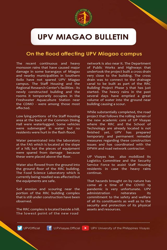That hazards brought on by nature has come at a time of the COVID 19 pandemic is very unfortunate. UPV administration reiterates its commitment to the safety and welfare of all its constituents as well as to the security and protection of its physical assets and resources.