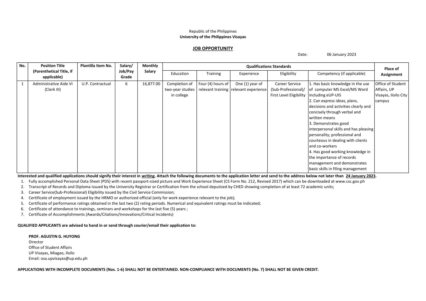 Place of Assignment: Office of Student Affairs, UP Visayas, Iloilo City Campus