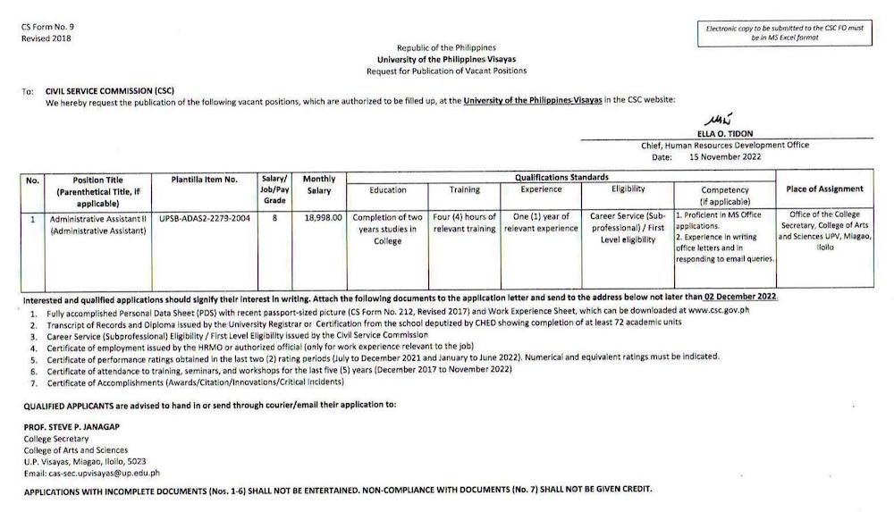 Place of Assignment: Office of the College Secretary, College of Arts and Sciences, UPV, Miagao, Iloilo