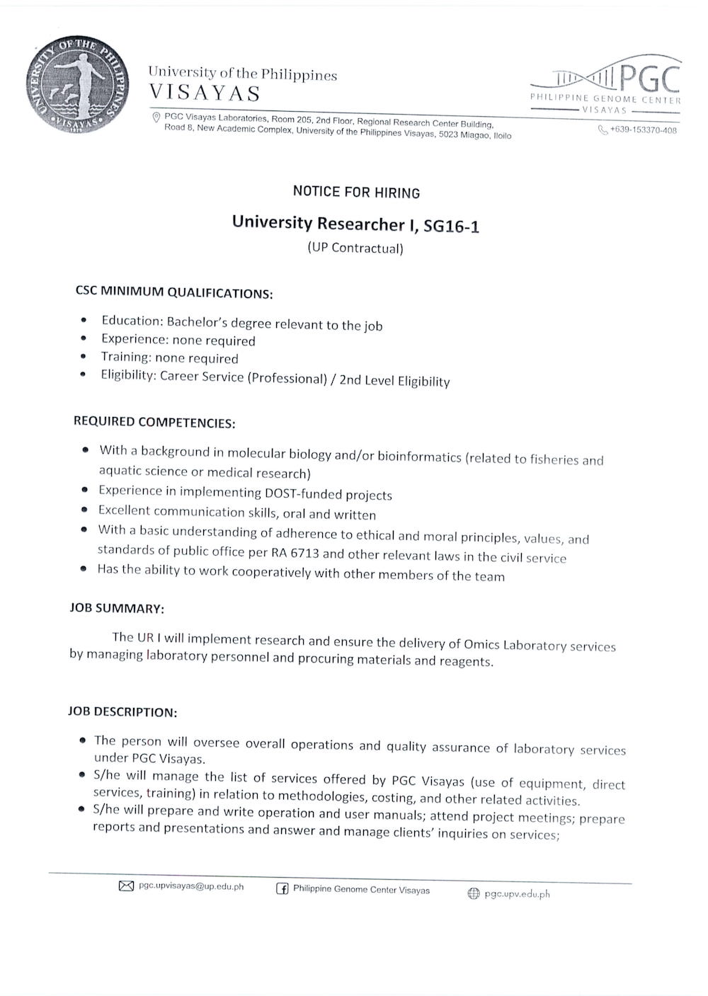 - The person will oversee overall operations and quality assurance of laboratory services under PGC Visayas.